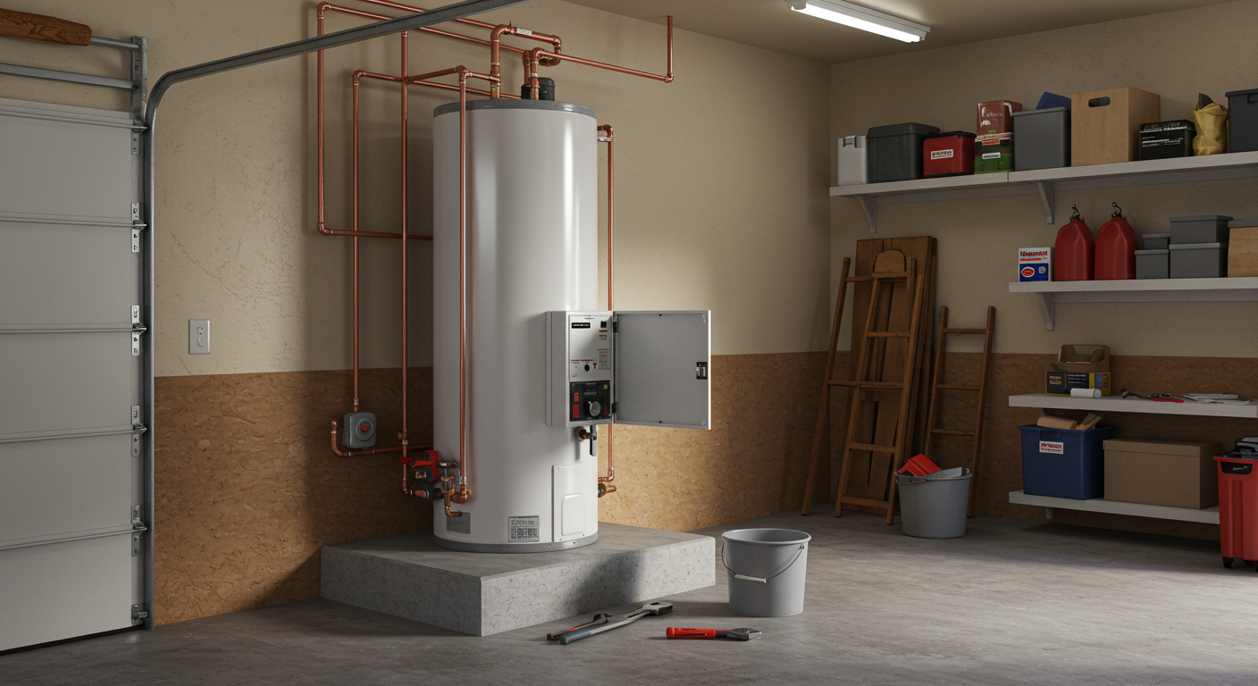 View of a residential water heater inside a home garage. A tall white tank water heater stands on a small concrete platform, clean and simple with minimal visible piping. An access panel on the heater is open, with a wrench and small bucket placed neatly on the floor beside it, showing routine maintenance in progress. Photorealistic style, natural lighting, sharp detail.
