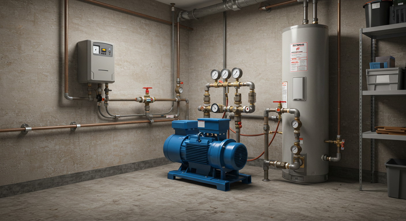 Close-up of a modern water pump system with a blue pressure tank connected to copper and PVC pipes. Valves, gauges, and fittings are neatly arranged, showing a professional installation. The pump and tank sit on a clean concrete floor in a utility room. Photorealistic style, sharp detail, natural lighting.
